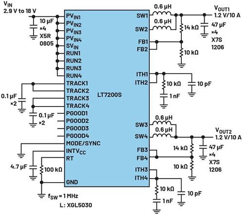 随着数据速度的提升和工作负载的增长,FPGA和SoC不断演进,以满足不断上升的速度和容量需求。电源也必须随之发展,在提供更大电流的同时,实现更高的功率密度。此外,简便性和可靠性同样重要。对于需要15 A以上电流的系统,可以并联多个LT7200S稳压器并错相运行,确保功率输送高效稳定。图1和图2展示了LT7200S的典型应用原理图,它支持双相和四相操作,通过并联为负载提供更高的输出电流。这款器件采用四相架构,四个内部同步降压型稳压器通道能够高效并联。每个通道能够输出或吸收±5 A的电流。当四相并联时,合计可向公共输出端提供高达±20 A的电流。而这是通过精密电流模式控制实现的,它能确保所有通道间精确均流,从而提升热平衡和系统可靠性。