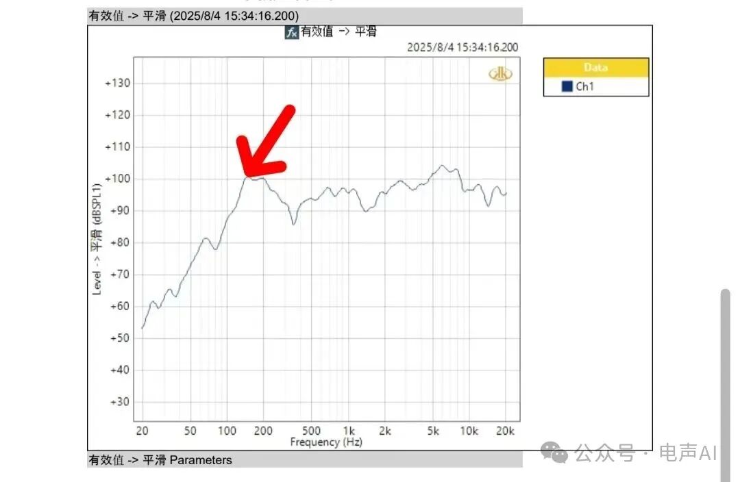 那就是频响曲线是低频段明显的峰值点,这个点基本就是F0。以下这个扬声器的F0是150Hz.与实际测试一致呢。