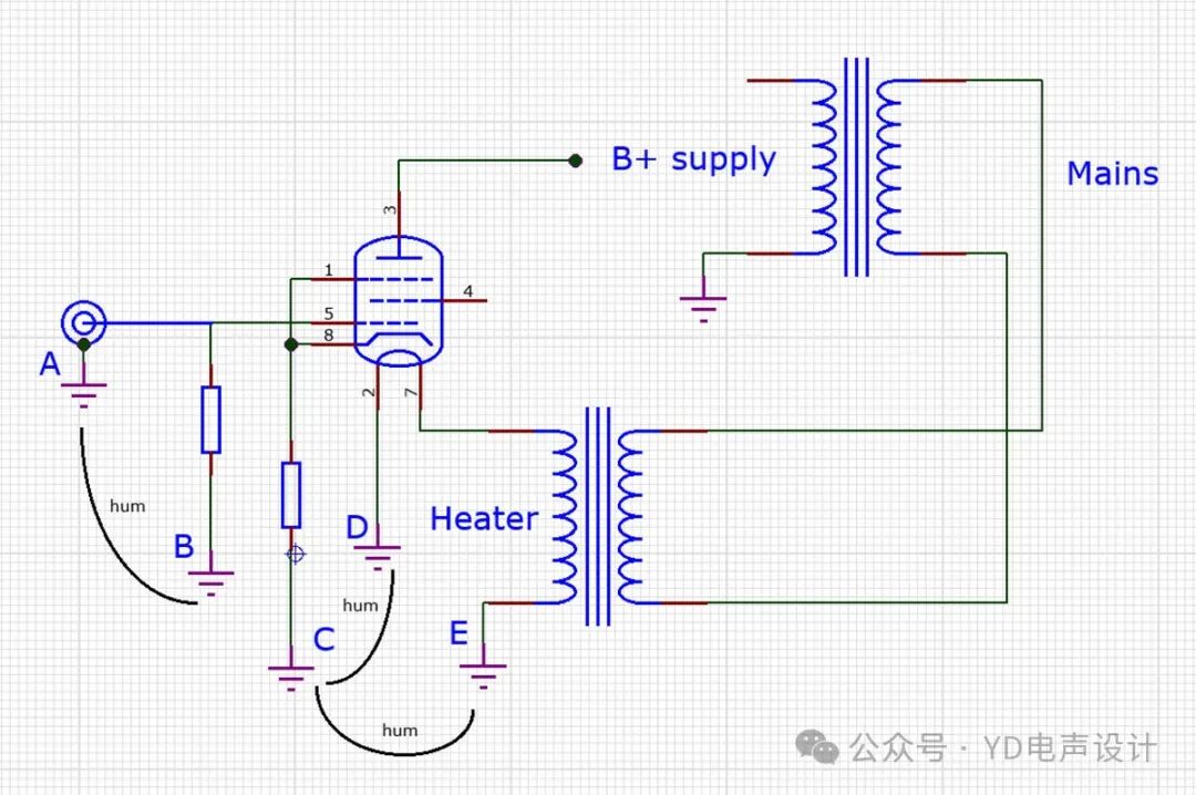但到达放大器输入的信号是什么?看图2。放大器输入信号是网格和阴极之间的信号,Vgk。如果所有接地点A到E的电压相同,那正是输入信号——摩擦就在那里!例如,假设加热器返回电流在D点和E点之间流动,由一些电线和/或底盘的一部分连接——由于它们之间的阻抗/电阻,这些点之间可能会造成嗡嗡声电压。因此,例如,如果A点连接到B点,C点和D点在E点连接(常见情况),并且B点和E点之间有一些电线和/或底盘部分,您几乎可以保证电网和阴极之间的嗡嗡声电压和嗡嗡声会从扬声器中出来。(我正在掩盖保护地球(PE)连接的问题,这可能会使整个事情复杂化)。