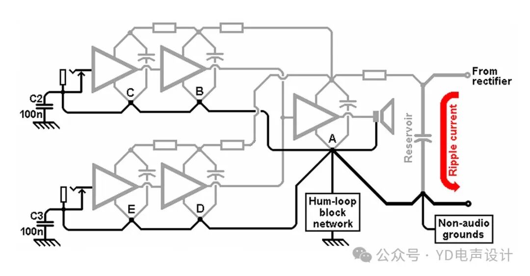 如果您想遵循这一点,每个块C、B、D、E都将有单独的地面返回点A。但音频设计总是一个妥协的问题:从前阶段返回的地面承载的电流相对较小,运行单独的地面会增加施工复杂性。如果处理电源级和电源的大电流布线使干扰低于可听水平,您的任务就成功了。