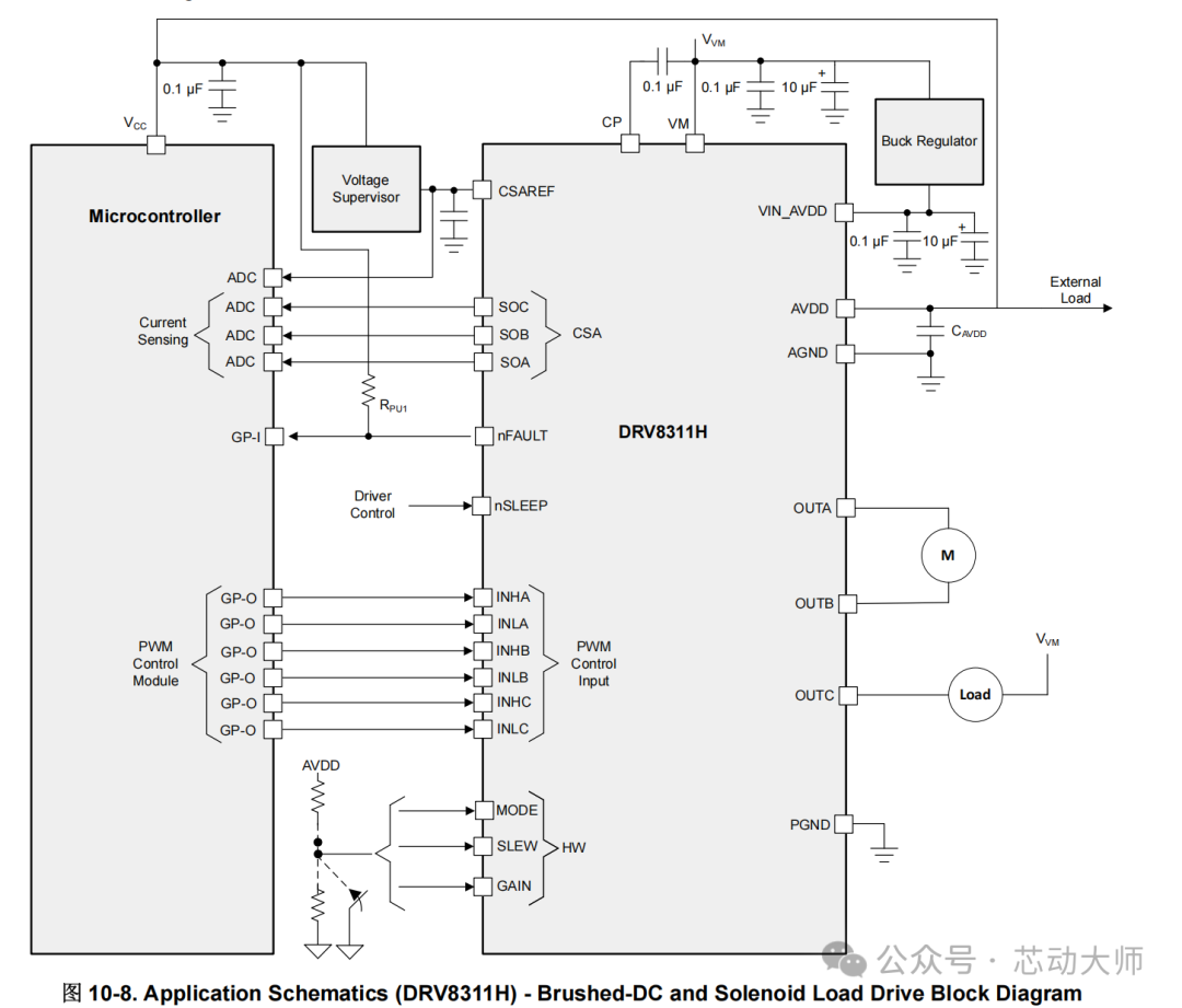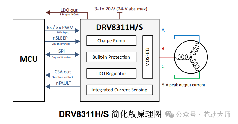 DRV8311HEVM 设计用于 3V 至 20V 的输入电源。DRV8311 包括三个集成半桥,可驱动高达 5A 的峰值电流,可与外部 MCU 结合使用,以实现有传感器或无传感器梯形控制、正弦控制或磁场定向控制 (FOC)。硬件模块分布如下:
