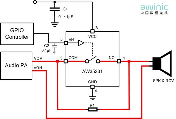 在听筒和喇叭二合一方案在模式切换时会面临阻抗不匹配导致的电流噪音问题,如何保证音频信号稳定传输,信号不失真是核心问题。艾为推出专用于高性能音频设备的高线性度、低失真的高性能音频模拟开关,可以切换高压音频信号通路,解决听筒和喇叭二合一方案不同模式下阻抗不匹配问题。AW35331FDR是一款单路SPST的高性能音频模拟开关,可以传输超低负压信号(-20V~20V),持续过流能力大于1.5A,导通阻抗低至90mΩ确保信号完整性和超低失真度的同时也适用于电源信号的切换,且适配1.2V IO控制逻辑。