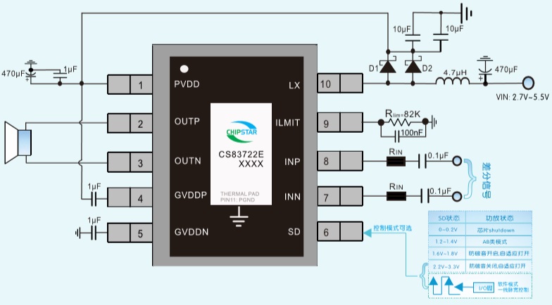CS83722E的全差分架构和极高的PSRR有效地提高对RF噪声的抑制能力。无需滤波器的PWM调制结构及内置的BOOST升压模块 ,以及CS83722E采用专有的AERC(Adaptive Edge Rate Control)技术,在音频全带宽范围内极大地降低了EMI的干扰,对60cm的音频线 ,在FCC的标准下具有超过20dB的裕量,另外CS83722E内置了过流保护,短路保护和过热 保护,有效的保护芯片在异常的工作条件下不被损坏。